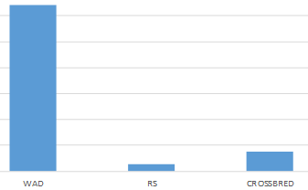 Herd size is a product of production function the herd size observed here ranged between 7.12 to 11.71 an indication that the herd size per farmer in this zone is small compare to other reports .Figure 2. present the distribution of goat breeds in the study area, with about ninety percent of the indigenous goats kept by the farmers as WAD with crosses and long legged Red Sokoto goat which were introduced to the zone. The predominance of the WAD in this area has to do with the socio- cultural and adaptive value of the goat to the farmers.