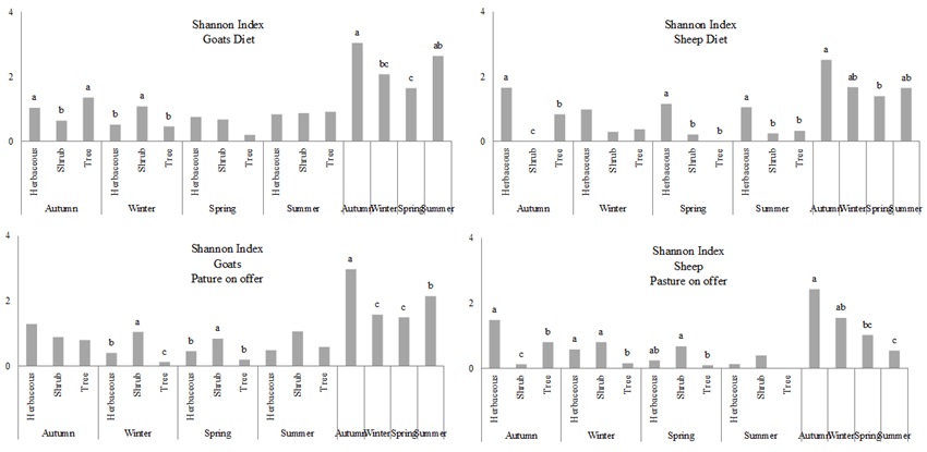 | Figure 5. Shannon index for diet and forage on offer in goats and sheep. Different letters indicate significant differences between vegetation in the same season |