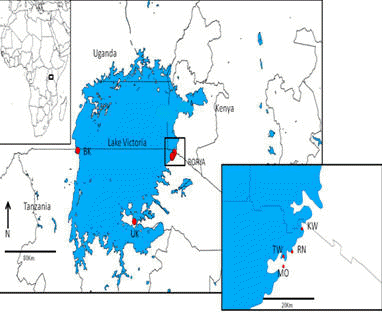 The study was conducted along the shores of Lake Victoria which included Kirongwe (KW), Masonga (MO), Tobwe River (TW), and Rasi Nyabero (RN) villages in Rorya district; Msozi villange in Ukerewe district (island) and Kemondo in Bukoba district. Sampling sites were: Shirati division, Ukerewe Island and Kemondo division. Generally all these areas experience a bimodal rainfall pattern, the short rains fall between October and December and the long rains from March to May. The average annual rainfall in the basin is estimated to be 1015 mm (Makalle et al 2008).