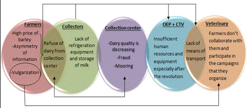 The Figure 2 and 3 show the constraints that are facing the different stakeholders as revealed by the two focus groups. The major problem for farmers of group 1 is the asymmetric information. This problem is related to a lack of communication between the various stakeholders in the milk value chain. Farmers are facing information problems with regard milk quality and acceptance norms mainly during the high lactation period. There are also problems related to extension and other related information. In addition, the refusal of milk by the collection centers is considered a big problem for these farmers. We also notice that these problems are interrelated to each other’s. The asymmetry of information is related to the dispersion and the isolation of farmers. Rejection of milk which happens mainly during the high lactation could be also linked to the lack of adequate refrigeration and storage facilities for collectors and at the collection centers. As a result, milk quality is a big issue which is the result of the lack of facilities but also to fraud and misconduct. The role of OEP and CTV (the extension services) is essential to deal with these issues but these latter actors are as well lacking human resources and other required means such as transport and these factors hinder their efforts to help the participants in the chain. Veterinarians are also complaining of lack of cooperation and means of transportation which affect negatively the interaction and cooperation along the value chain.
