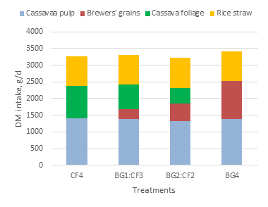 | Figure 1. Effect of varying the offer levels of cassava foliage (CF) and brewers’ grains (BG) on the components of the diet DM consumed |