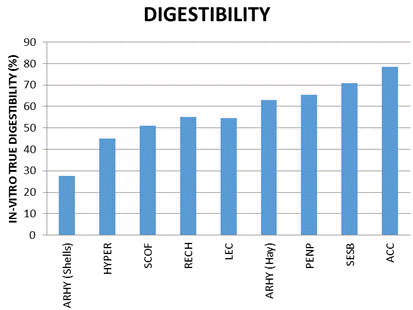 The results shows that Acacia anguistissima, Sesbania sesban and Pennisetum purpureum had a higher digestibility while Arachis hypogaea(hay),Richardia scabra, Leucaena leucocephala and Sacharum officinarum (cane leaves) had moderate digestibility. The lowest values were observed in Hyparrhenia species and Arachis hypogaea (shells).