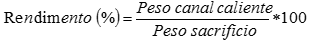 Las canales obtenidas, sin la cabeza, (canal caliente) se pesaron en una báscula aérea con precisión de 0.1 kg y se calculó el rendimiento con base en la canal caliente, a partir de la expresión: