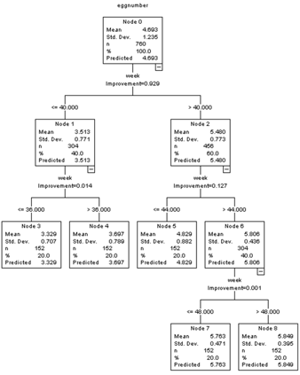 tree displayed the optimal age (weeks) for egg number. Birds that are 48 weeks older are expected to produce more eggs than those of earlier ages. |