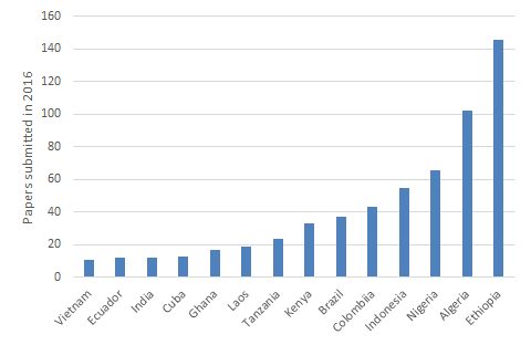 Ethiopia and Algeria are the countries at the head of the list of submitted papers, followed by Nigeria, Indonesia, Colombia, Brazil, Kenya, Tanzania, Laos, Ghana, Cuba, India, Ecuador and Vietnam (Figure 2). Papers were submitted from 60 countries in 2016, compared with 55 in 2015.