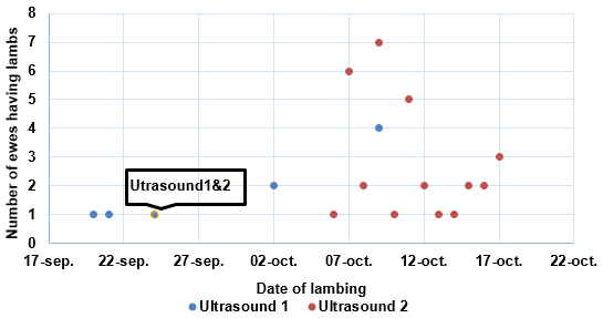 | Figure 3. Distribution of lambing of treated ewes according to the 1st and 2nd ultrasound pregnancy diagnosis. |