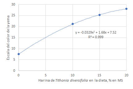 El color de la yema mostró un incremento curvilineal con los niveles de tithonia (Figura 3). Está bien documentado que las harinas de hojas son una buena fuente de pigmentos para las yemas debido a la presencia de xantofilas y compuestos carotenoides en estos alimentos (Chen y Bailey 1988; Medina y Carreño 1998). Resultados similares se observaron cuando se alimentaron gallinas con diferentes niveles de harina de hojas de Gliricidia sepium (Odunsi et al 2002), Leucaena leucocephala y Moringa oleífera (Abou-Elezz et al 2011). El mejor color de la yema pudiera aportar un valor agregado al huevo ya que es una característica de selección por el consumidor y, además, estas sustancias pigmentantes aportan beneficios a la salud humana por sus funciones antioxidantes e inmunomoduladoras (Olugbemi et al 2010; Englmaierová et al 2013).