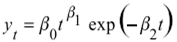 En las funciones: Y (t) es la producción de leche diaria, t es tiempo en días de pesaje,β0, β1 y β2, son los parámetros específicos de cada función donde:β0 = producción inicial,β1 = producción al pico, y β2= descenso de la producción post pico hasta el secado.