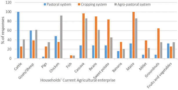 Results indicated that each production system has undergone transition in enterprises by either reducing; introducing or scaling up albeit based on shocks experienced (Figures 2a &b). The pastoral system has embraced some crop production particularly the cereal, root crops, fruit and vegetable production while reduction in small stock has also been realized among the pastoral and crop production however, small stock have gained in the mixed system while fish farming has also been adopted in the crop and mixed systems, an opportunity that comes with increasing floods under climate change. The study further revealed that there was variation in the use of improved varieties and/or breeds among the three production systems with majority of the livestock production system keeping only local breeds of livestock compared to those keeping both local and improved breeds and those with only improved breeds. Majority of the crop households used at least one improved variety and non-improved/traditional crop varieties. The majority of the agro-pastoral households kept local breeds of livestock, with a third of households keeping improved breeds of livestock compared with those who kept both local and improved breeds of livestock. At least majority of cropping households use improved crop variety.
