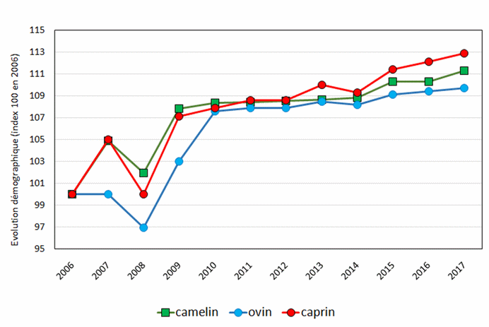 | Figure 2 Graphique d’évolution des effectifs camelins, ovins et caprins 2006-2017 dans la willaya (source: DSA 2018) |