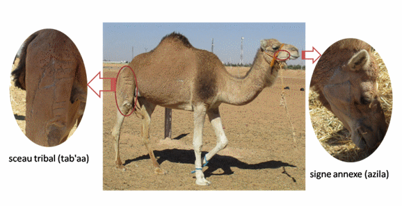 L’effectif enquêté s’élève à 11 904 têtes camelines (dromadaires), dominé par des femelles (65 p 100) assurant à la fois, le croît interne des troupeaux et la production de lait. Les élevages enquêtés comprenaient des dromadaires de population Sahraoui (97,2% environ), Chaâmbi (0,9% environ), Targui (1,8% environ) et des métis (0,02% environ). Chaque éleveur estampille ses dromadaires au fer rouge avec un sceau tribal de propriété apposé généralement sur le côté droit de l'animal (la cuisse ou le cou), et d’un signe annexe apposé sur la joue ou l’oreille pour individualiser l’animal, pour l’identifier (Figure 2).
