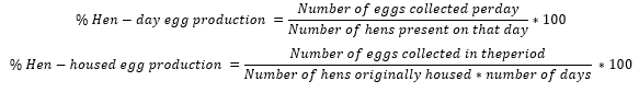 Eggs were collected three times a day. Egg production was calculated on a hen-day basis (Hunton 1995) as.