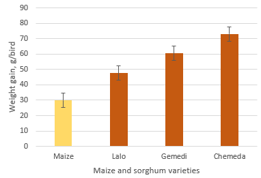 Dry matter intake was higher on sorghum diets than on maize with no differences among sorghum varieties. By contrast, body weight gain was much higher on sorghum than on maize with weight gains increased in order of Lalo, Gemedi and Chemeda varieties of sorghum. Egg production and feed efficiency showed similar trends in favor of sorghum compared with maize with no differences among sorghum varieties. Egg quality was not affected by the source of grain. The possible explanation why these specific sorghum varieties should be superior to maize in support of egg production is their superior nutrient profiles as evidenced by higher levels of crude protein and calcium and less crude fiber and according to other researchers, a better balance of essential amino-acids in the protein, especially lysine. The new varieties of grain sorghum recently released in Ethiopia can replace maize in diets of laying hens with increased egg production and better growth and feed conversion, and no change in egg quality, compared with maize.