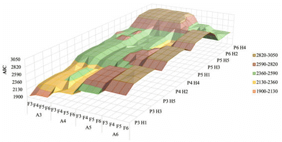 | Figure 2. A 3D plot showing the modified Akaike information criterion (AIC) of random regression models used for genetic evaluation of milk yield in the second lactation of dairy goats, using different orders of Legendre polynomials. Notation of the models follows the pattern: fixed (F), additive (A) and permanent environment (P) effects, and number of classes of residual variances (H) |
