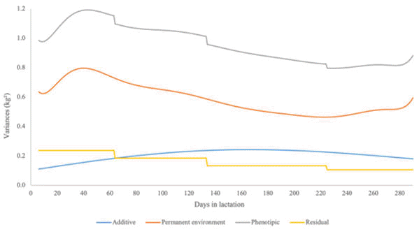 | Figure 4. Additive, permanent environment, residual and phenotypic variances over days in lactation for milk yield in the second lactation of dairy goats, estimated using the best random regression model (i.e., F6A3P6H4; which used 6th order Legendre polynomials for the fixed and permanent environment curves, 3th order Legendre polynomials for the additive genetic curve, and four different classes of residual variances) |
