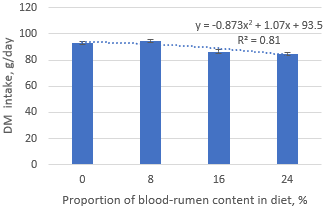 A study was conducted to evaluate the feeding value of dried bovine blood-rumen content mixture (1:1 ratio) in layers ration. Four treatments were compared with 180 layers allocated at random to 3 replicates (12 pens each with 15 layers). The treatment rations formulated were isocaloric and isonitrogenous using dried bovine blood-rumen content mixture at an inclusion level of 0% (BRC0), 8% (BRC8), 16% (BRC16) and 24% (BRC24) to meet the nutrient requirement of layers. Crude protein and metabolizable energy of dried bovine blood-rumen content mixture (BRC) were 46.9% and 2390 kcal ME/kg/DM. Inclusion of BRC at 8% of the diet of layers improved feed intake, egg production, egg mass and feed conversion ratio but as inclusion level increased above 8% these responses decreased. It is concluded that BRC inclusion in layers’ ration at 8% can partially replace soyabean and noug cake without any deleterious effects on animal health and laying performance.