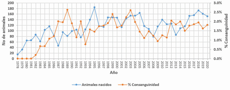 | Figura 1. Evolución del número de animales registrados y consanguinidad por año de nacimiento |