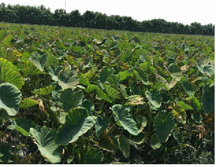 Some farmers grew taro (Colocasia esculenta) for the edible corm as a starch source for people food and crop along with rice planting for family income in Viet Nam. After 5 to 6 months of vegetation period when about 60% leaves defoliated, taro corms were harvested and foliage left behind and burned in the field. According to Lampheuy et al (2012) taro foliage proportion average accounted for 52 to 62% and the leaves contained greater CP and CF than petioles; and total essential amino acids (arginine, histidine, isoleucine, leucine, lysine, methionine, phenylalanine, threonine, tyrosine and valine) ranged from 40.5 to 42.5g/16gN.