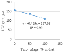 | Figure 1. Effect of dietary taro silage on DM intake | Figure 2. Effect of dietary taro silage on LW gain |