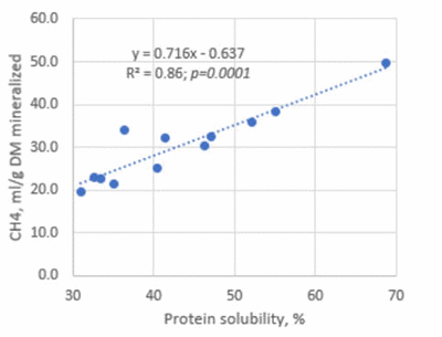 Recent data (Figures 6 and 7) show that there are major differences between grasses and leaves of trees and shrubs suitable as animal feed. Grasses, in the digestive tract produce more than twice as much methane compared with the edible tree leaves that are readily consumed by ruminants. The differences are apparent irrespective of whet the grasses whether the sole diet (Figure 6) or were fed as supplements in a high-energy diet (Figure 7). The other finding in common to both sets of data is the close correlation between rate of gas production and the proportion of methane in the gas (Figures 8 and 9). The implication of these findings is that if rumen fermentation is reduced then more feed components will escape rumen fermentation and be available for digestion in the intestine and/or acetogenic fermentation in the cecum-colon (see Phonethiep et al 2016).