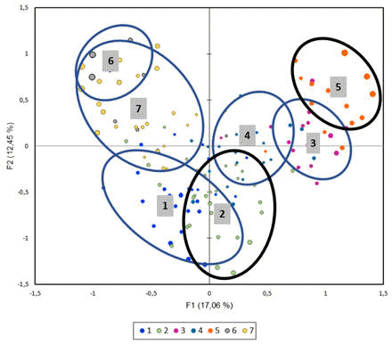 Après recodage, élimination des variables à modalité unique, transformation des quelques variables quantitatives (effectifs) en modalités selon leur distribution, calcul de quelques ratios (mâles/femelles, jeunes/adultes, etc.) et regroupement des modalités rares avec d’autres, 49 variables qualitatives ont été construites regroupant 131 modalités (Tableau 2). En cas de données manquantes (qui ont concerné moins de 5% des données), les valeurs ont été estimées par la méthode des moyennes (données quantitatives) ou par la méthode du plus proche voisin (données qualitatives). Les variables quantitatives ont été conservées dans un feuillet séparé du tableur Excel pour décrire ultérieurement les différences régionales et illustrer les types d’élevage identifiés.