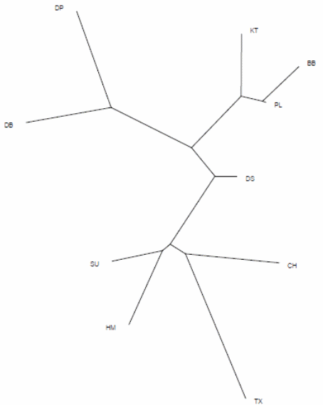 Neighbor-Joining procedure. Breeds: BB, Blackbelly; CH, Charollais; DB, Dorper white; DP, Dorper; DS, Dorset; HM, Hampshire; KT, Katahdin; PL, Pelibuey; SU, Suffolk; TX, Texel |