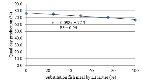 The study purposed to evaluate the effect of substitution of fish meal by larvae of Hermetia illucens (HI) supplemented with Trichoderma sp on quail's nutritional utility and egg production. Two hundred quails aged 9 weeks with the bodyweight of 172.7 ± 12.79 g were randomly placed on 5 dietary treatments, i.e. HI 0 (100% fish meal), HI 25 (75% fish meal + 25% (HI + 2% Trichoderma sp), HI 50 (50% fish meal + 50% (HI + 2% Trichoderma sp), HI 75 (25% fish meal + 75% (HI + 2% Trichoderma sp), HI 100 (100% (HI + 2% Trichoderma sp). Data were analyzed using analysis of variance in a completely randomized design.