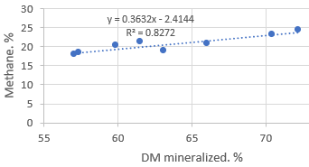 | Figure 3. Relationship between gas production and percent of methane in the gas |