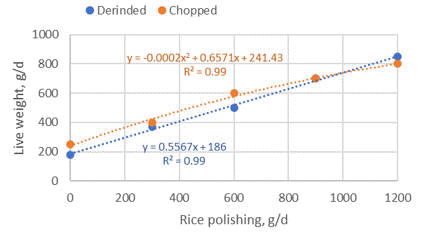 Rice polishings was the only available candidate as the source of bypass protein. It was assumed that he presence of 15% residual oil in this product would act as a deterrent to rumen microbes thus facilitating the escape of the protein and the starch from the rumen to the lower digestive tract. This hypothesis was proved by the responses in live weight gain according to the level of this supplement (Figure 5).