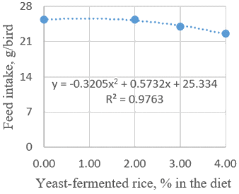A completely randomized design was used for this study to determine growth performance and carcass traits of local crossbred chickens. The experimental animal in the study was local crossbred chickens (between Noi chickens and Binh Dinh chickens). A total of 120 chickens from 3 to 8 weeks of age was allotted in four treatments (10 chickens per replicate and balanced for sex). The chickens had ad libitum accessed to feed and water. These treatments were the aqueous extracts from four levels of yeast-fermented, polished rice (0, 2, 3 and 4% of the daily allowances of DM) that were sprayed on the daily feed allowance of the chickens.