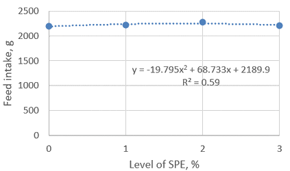 Ration consumption during the study on broilers given SPE is seen in Table 1 and Figure 3. The results showed that broiler feed intake without SPE was not significantly different (P> 0.01) compared to those given SPE. The highest average ration consumption was achieved by broilers who received P2 treatment (giving SPE 2%), namely 2273.22 ± 10.49g and the lowest was shown by treatment P0 (without giving SPE), namely 2198.23 ± 48.63 g. This shows that the provision of SPE in feed can increase ration consumption. Feed intake is the amount of food consumed by livestock which is used to fulfill their basic life and for the production of these animals (Winarno, 2004). The results of the calculation of feed consumption as measured by the feed given during one maintenance divided by the number of population.
