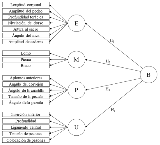 En vista de la importancia de este enfoque estadístico y la necesidad estudiar conjuntamente los rasgos, el objetivo de este trabajo fue evaluar las relaciones de las variables que miden la conformación corporal de las vacas de la raza blanco orejinegro (BON) a través de un modelo de ecuaciones estructurales.