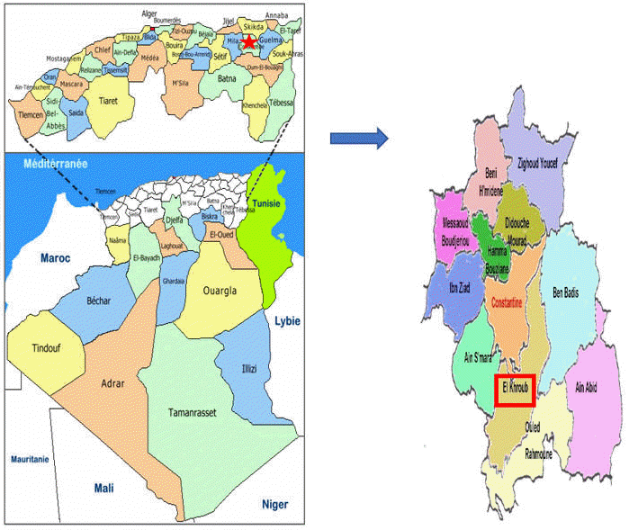 Cette étude a été réalisée dans une ferme pilote démonstrative sise dans la commune d’El Khroub (Figure 1) (Latitude: 36°15′47″ Nord ; Longitude : 6°41′36″ Est ; altitude : 630 m) située à 13km du chef-lieu Constantine.