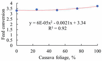 Curvilinear trend in DM feed conversion as replacing soybean meal with casava foliage meal in the diet of growing rabbits |