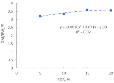 The nutrient intake and metabolism energy were increased and DM intake per body weight was improved, all with curvilinear trends, as the offer level of RDB was increased (Table 3: Figures 1).