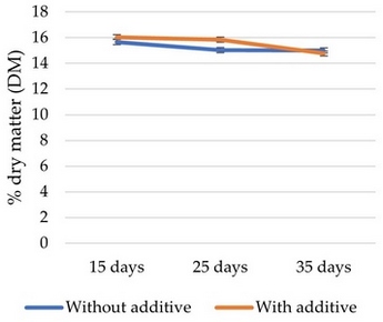 The pH is an analytical indicator used to evaluate the quality of silage. It can be affected by the type of matter that is used, the size of the particle, and the fermentable potential (Reyes-Gutiérrez et al 2018). The pH descends during the fermenting phase when the microorganisms (own of the ensiled matter and additions) produce lactic acid from the fermentable carbohydrates (Hartinger et al 2019).