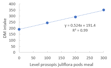 A study by Hassen et al (2017) on the effect of supplementing pounded P. juliflora pods on Afar goats fed on Blue panicgrass (Panicum antidotale) hay and P. juliflora reported feed intakes of 516, 509, 475 and 469g for goats fed 0, 150, 300 and 450g of prosopis respectively. The feed intake reduction as levels of prosopis increased could be due to phenolic compounds leading to a decrease in palatability and hence low feed intake (Hassen and Bediye 2015).