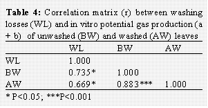 The WL values of the sun-dried leaves were also significantly correlated (P<0.05) with in vitro potential gas production of either the unwashed or the already washed samples. In Table 4 are shown the details of these relationships.