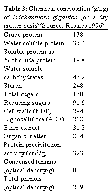 In a qualitative screening test (biochemical preliminary test) for anti-nutritional compounds, no alkaloids or condensed tannins were found in Trichanthera and the saponin and steroid contents were low (Rosales and Galindo 1987). In other, more precise, tests the contents of total phenols and steroids were found to be 450 and 6.2 ppm, respectively (Rosales et al 1989). The great variation in its total phenol content, from 450 to 50,288 ppm (Table 1), could be one reason for the apparent variation in its nutritional value.