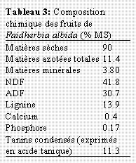 La composition chimique des fruits de F. albida a été déterminée par dosage des matières azotées totales du calcium et du phosphore (AOAC 1975) puis des composants pariétaux , NDF, ADF lignine par les méthodes de Van Soest (Goering et Van Soest 1979). La teneur de l'échantillon en tanins condensés a été estimée par colorimétrie après extraction aqueuse et précipitation par la méthode de Swain améliorée par Seigler (Seigler et al 1986).