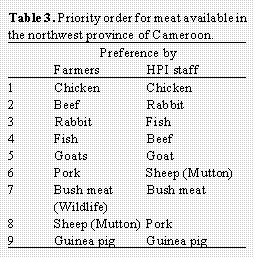 The survey results showed that chicken meat was the overwhelming first choice of both farmers and project staff. This was not surprising given that for generations chickens have been, and continue to be, the most widely raised type of animal in most rural areas in West Africa. For farmers, beef was a distant second to poultry. There are presently over 500,000 head of beef cattle in the northwest province (MINEPIA 1993). However, the worsening economic crisis in Cameroon and the high cost of beef (about US $1.00 and $2.00 per kilo at the village and urban levels, respectively) has made this meat unaffordable by many rural families. Primarily on grounds of health conscious issues (eg: higher fat and cholesterol levels in beef) beef was ranked lower by staff than by farmers. Similar explanations account for the ranking of pork by farmers and project staff.